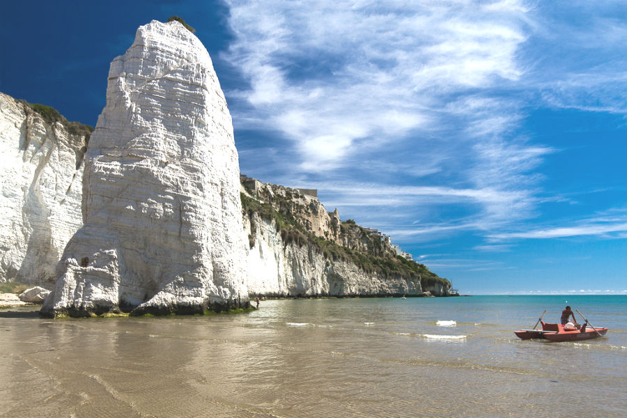 Se levanta por 26 metros este enorme diente de piedra caliza que simboliza Vieste. Ciertamente no es el lugar favorito para los nudistas y los solicitantes de la naturaleza, pero para las familias y los niños es realmente una buena playa para un día en el mar. La arena es suave y dorada y tramos de playas libres se alternan a otros con establecimientos. Hay espacio para todo el mundo y el centro de Vieste está a tan sólo 500 metros a pie.